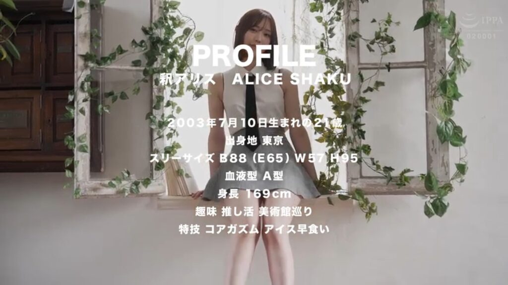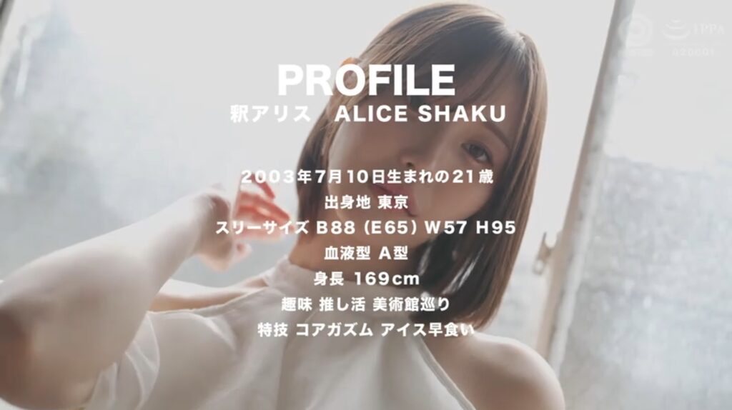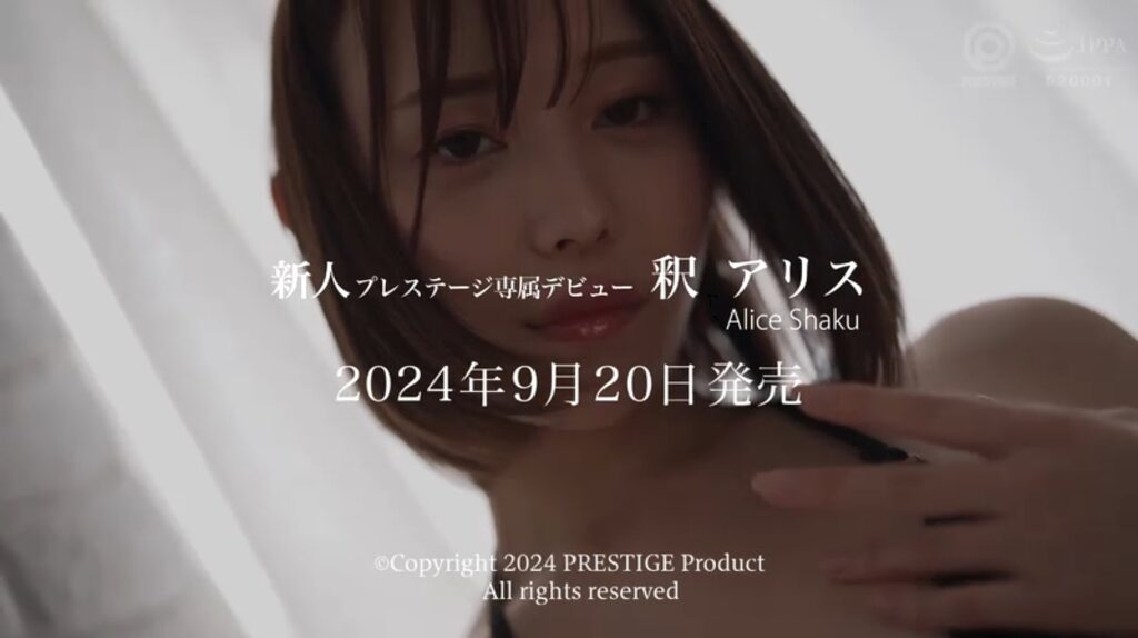 2024年9月、プレステージ専属女優として「新人 プレステージ専属デビュー 釈アリス 黄金の9頭身 1度ハマったら帰れない、アリスインワンダーランドへようこそ。」にてAVデビューしました。